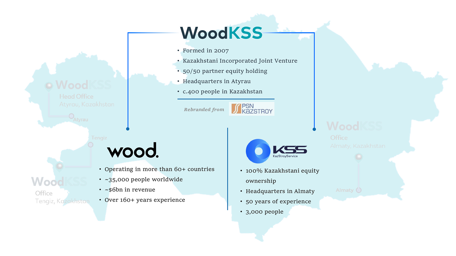 WoodKSS is a joint venture between Wood Plc and OGCC KazStroyService JSC. The company has been successfully providing design, project management, and construction services in the oil and gas and industrial sectors of the Republic of Kazakhstan since 2007. WoodKSS has successfully implemented projects that contributed to the development of the Tengiz, Kashagan, Karachaganak, Kalamkas-Khazar, Dunga fields, and others.